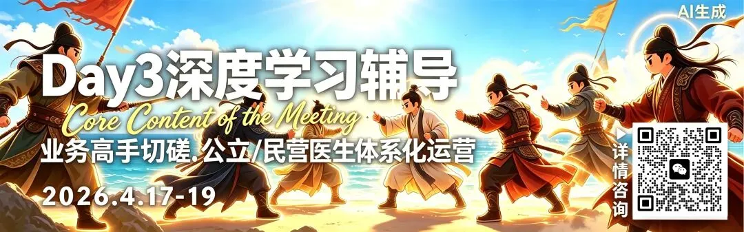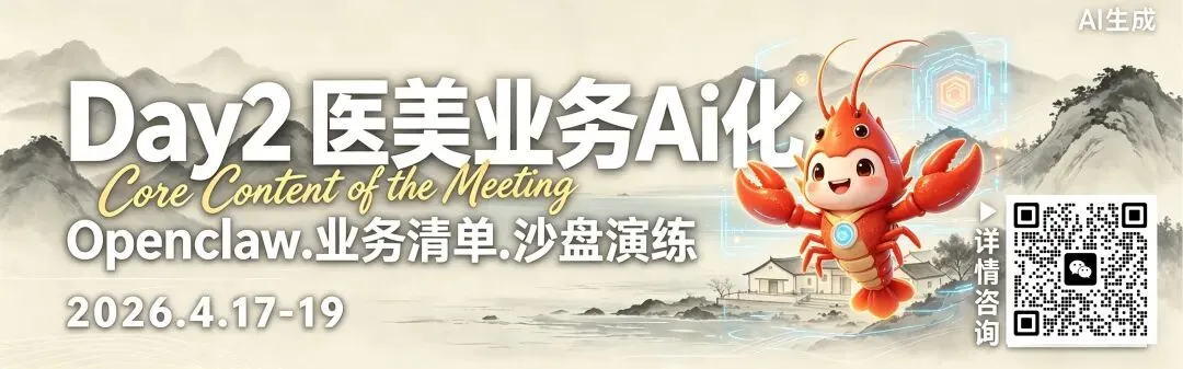 14:00~18:00,黄闯.主讲“医生MCN”-核心战略发展路线,品牌型医生的增长机会(GEO,Agent),低成本流量价值,医美网咨+Ai,医美管理价值(工作清单),内部经典案例《团队管理老化之企业变革》沙盘演练