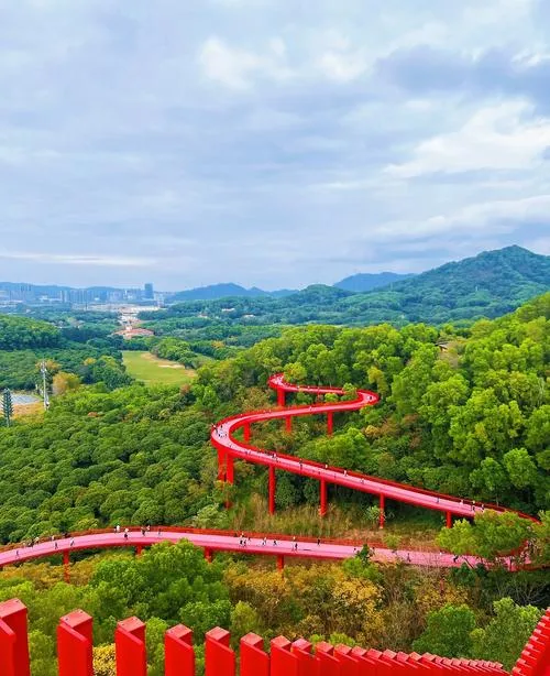 金马山的盘旋桥是个很容易被低估的设计。大部分人第一次看到会觉得就是个拍照打卡的地方,绕来绕去挺好看,但你真走上去会发现这个桥改变了你对山地空间的感受。一般爬山是垂直的,你要么往上要么往下,但盘旋桥把这个过程变成了水平的螺旋,你在同一个高度范围内不停转圈,视角每隔几秒就换一次,这种体验很特别,它让你用最慢的速度看完最多的角度。