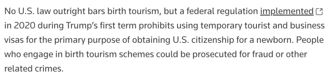 虽然美国没有法律明确禁止出生旅游,但根据特朗普第一任期间实施的一项联邦法规:禁止将临时旅游和商务签证用于为新生儿获得美国公民身份的主要目的。