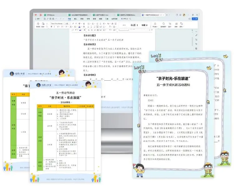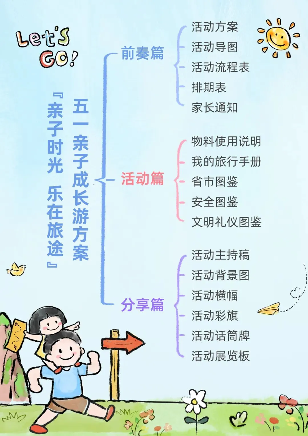 幼儿园“五一劳动节”活动方案:含亲子旅行、劳动小能手劳动两大主题1 “亲子时光·乐在旅途” 幼儿园五一亲子成长游活动 01 打破常规,别出心裁 抓住家庭出游的时间节点,打破传统的教育模式,用亲子出游这一实践教育方式,让孩子们在游玩中增长见识,强化家园合作。 02 整套方案及素材一次打包带走 提供整体活动方案及配套素材,包括亲子互动素材,让您轻松筹备,享受无忧亲子时光。