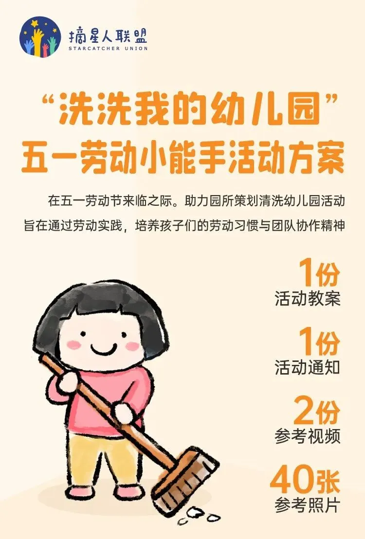 随着五一假期的脚步渐近,摘星人联盟为幼儿园准备了亲子旅行与园内劳动两大特色活动方案: