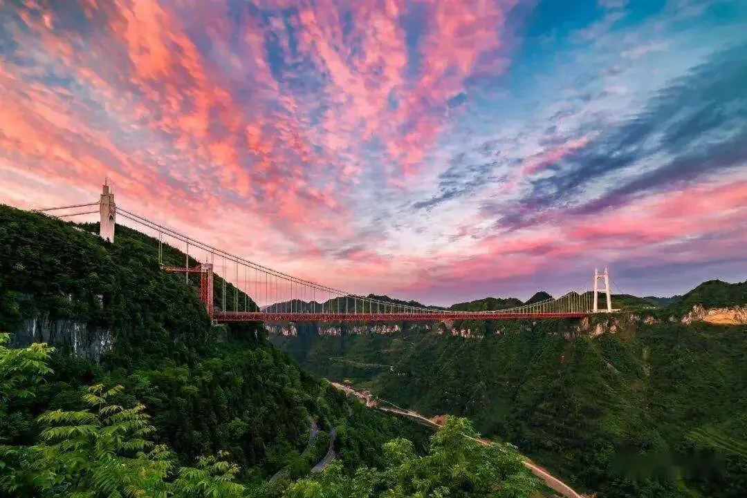 德夯大峡谷中,一座世所罕见的特大悬索桥。 凌空飞架于大峡谷之上,犹如一条钢铁巨龙横卧在山间,这个不普通的天空之桥直接拿下了四个世界第一。
