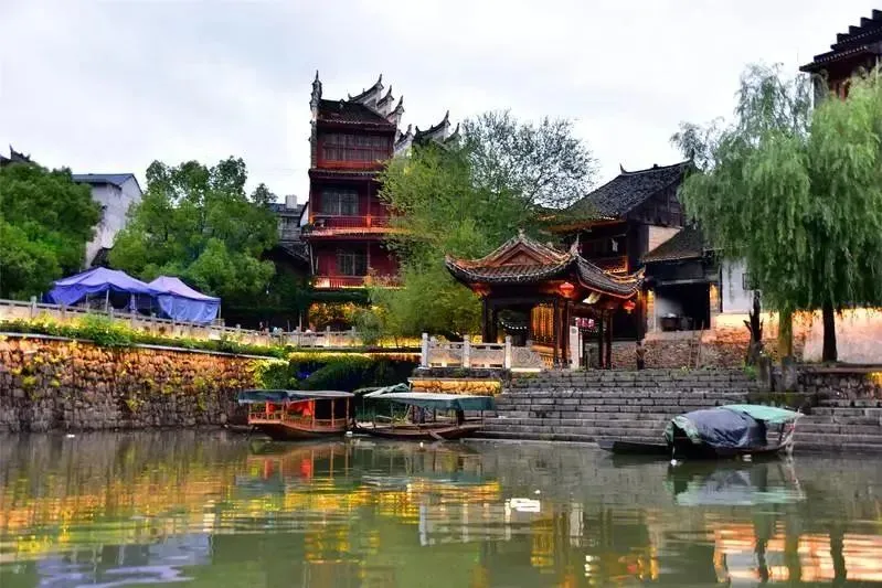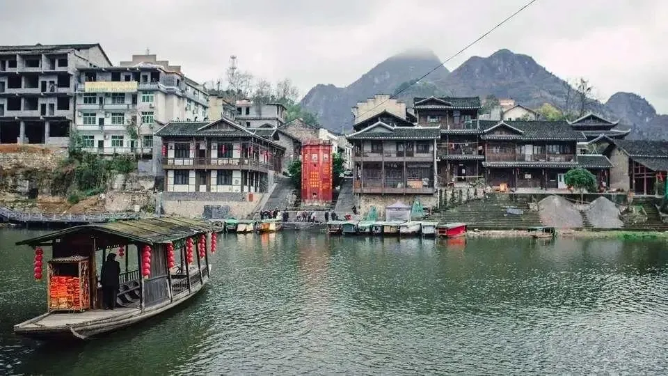 悠悠的河水绕着镇子流淌,青石板的道路两边都是古色古香的吊脚楼,古渡口,还有扁舟静静的摆动着。