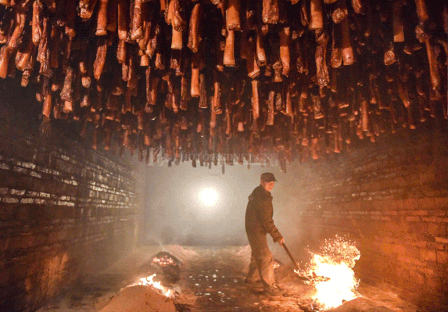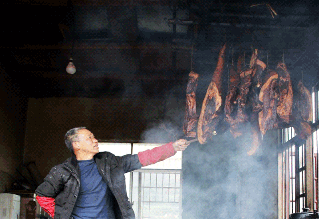 而且湘西腊肉必须要经过烟熏,暗火燃着茶壳、橘皮、松果、谷糠、柏叶等,一共要青烟袅袅地熏上七八天,再吊在民居里数个月,腊肉才能真正成型入味。