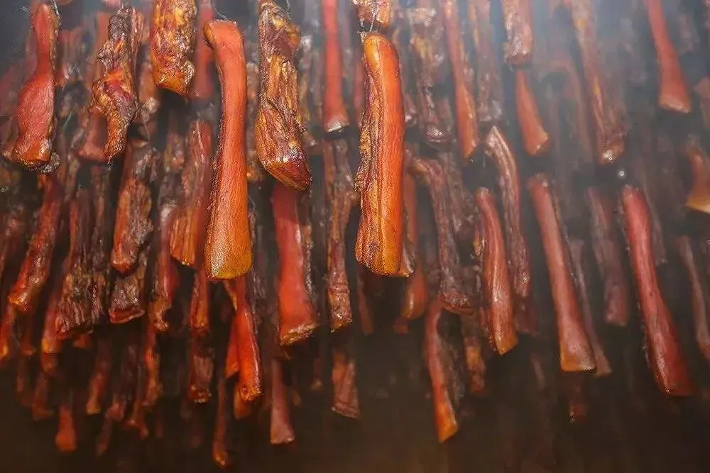 湘西腊肉 湘西当地人并不爱饲养“良种猪”,而偏爱本土猪的“小样猪”。 虽然个头小,但是天天在山里跑,吃起来肉质紧实,油而不腻,做烟熏腊肉最是好。