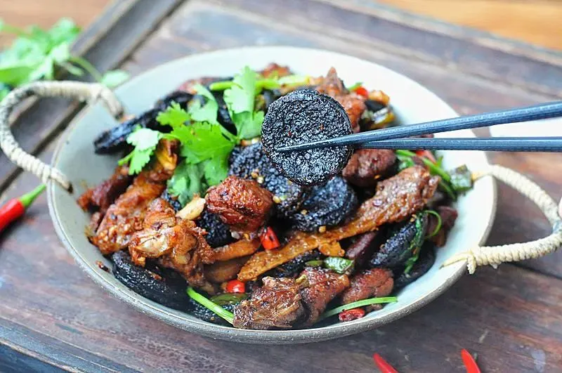 杀一只鸭子,鸭血放入盆中,顺手倒入糯米一起凝固,蒸熟后切片和鸭肉一起炒,再下入干辣椒和青红椒,就是一碗地道的湘西血粑鸭。
