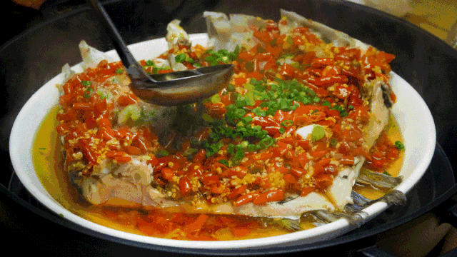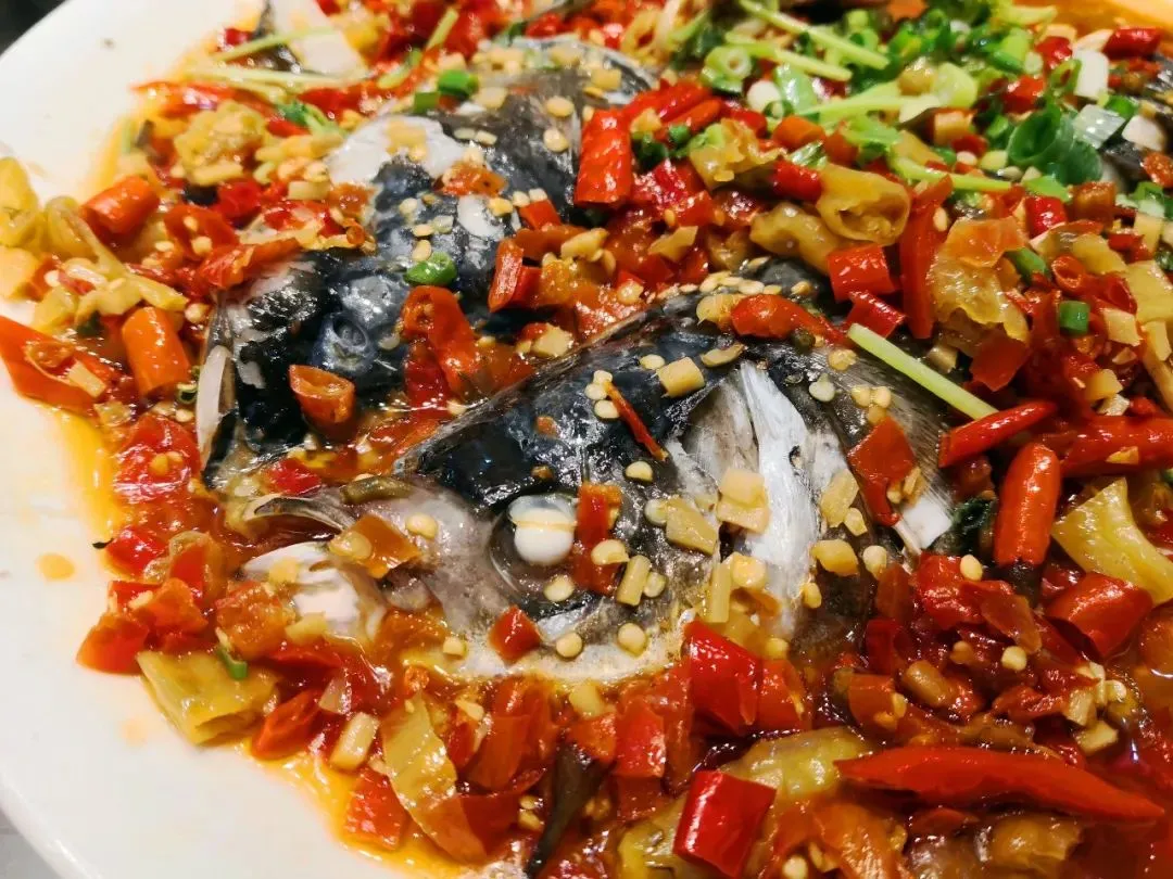剁椒鱼头 剁椒鱼头不用说了吧,一只片开的鱼头,一层厚实的剁椒,一碟面条,一勺香油,这是湘西最爽辣也最出圈的美食。