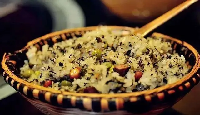社饭是将糯米、籼米、野香蒿、野葱、腊肉、猪油、花生米等,拌在一起蒸煮而成,风味独特,饱含民族风情。