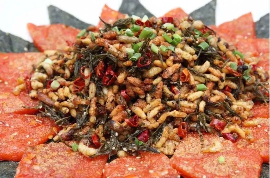 百虫宴 百虫宴上的所有菜色均以虫子为主,桃花虫、蜂蛹、蝉猴、竹虫、水蜈蚣、蚯山子、瓢瓜虫等等,都是苗家特产菜。