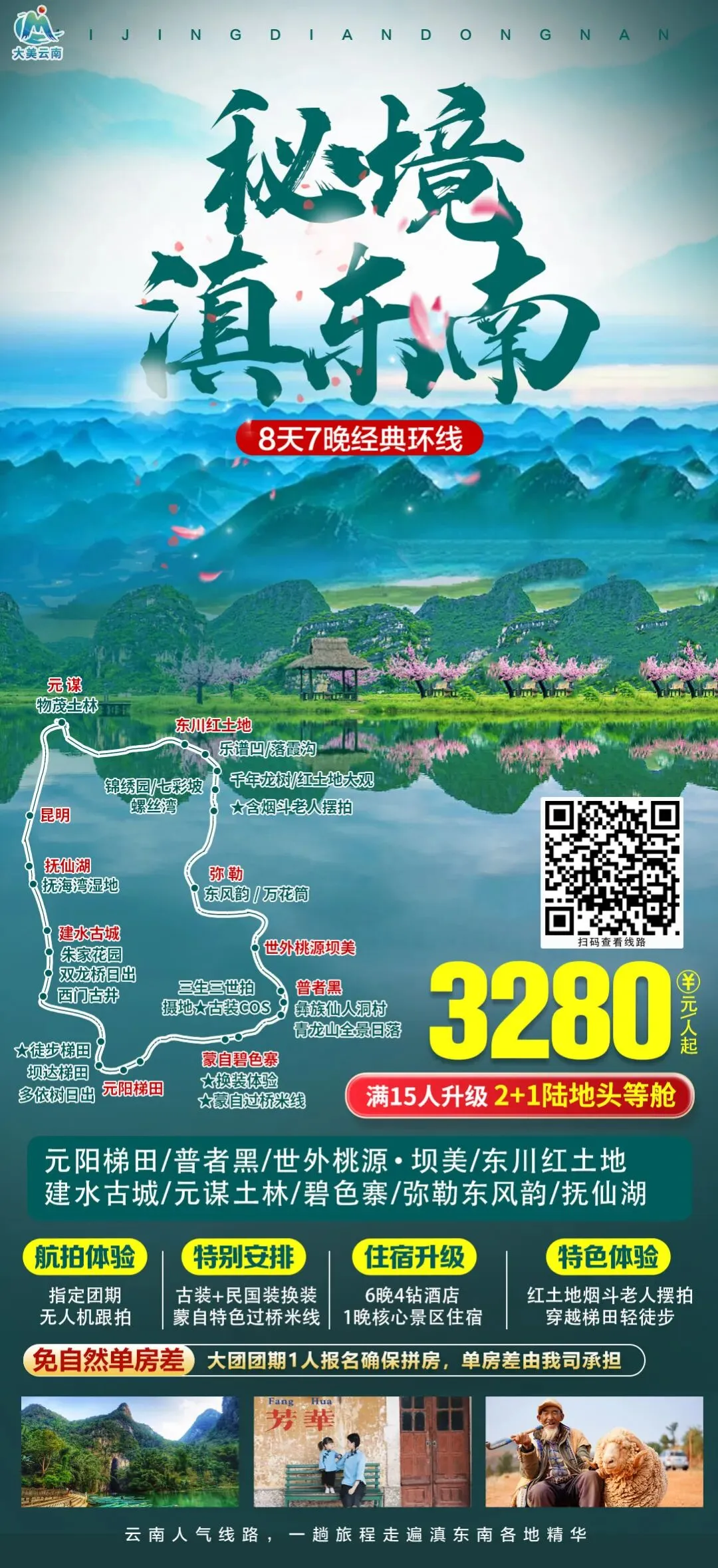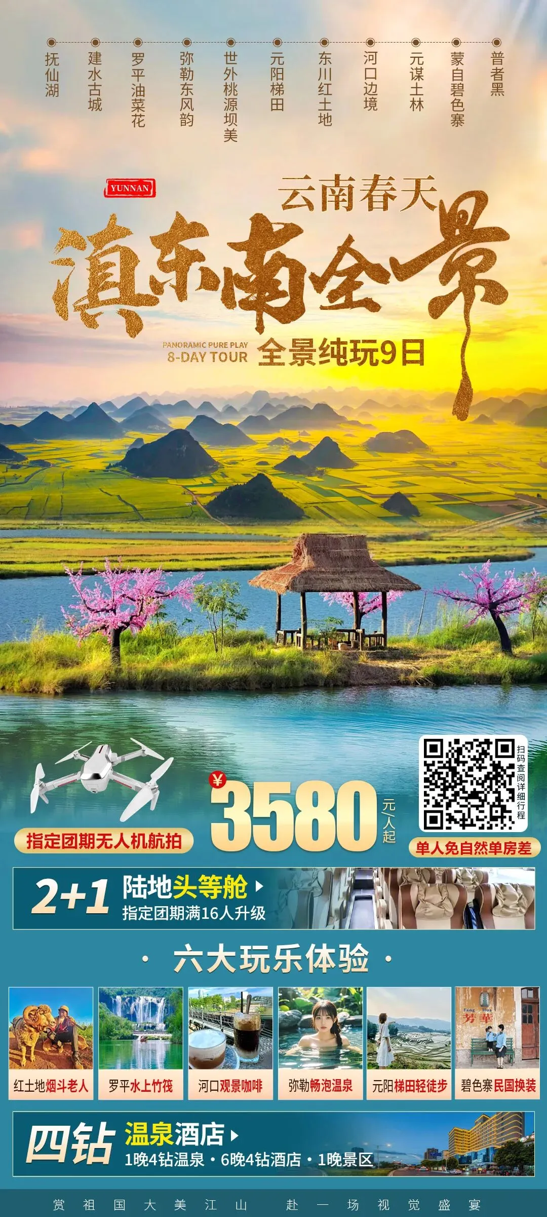 产品亮点:免自然单房差,每期满16人升级2+1陆地头等舱,指定8个团期满11人安排领队带无人机,7晚4钻酒店+1晚核心景区,东川红土地烟斗老人摆拍,罗平九龙瀑布乘水上竹筏,蒙自碧色寨民国换装,弥勒泡温泉,元阳穿越梯田轻徒步,世外桃源坝美乘船穿越水洞,河口观景咖啡