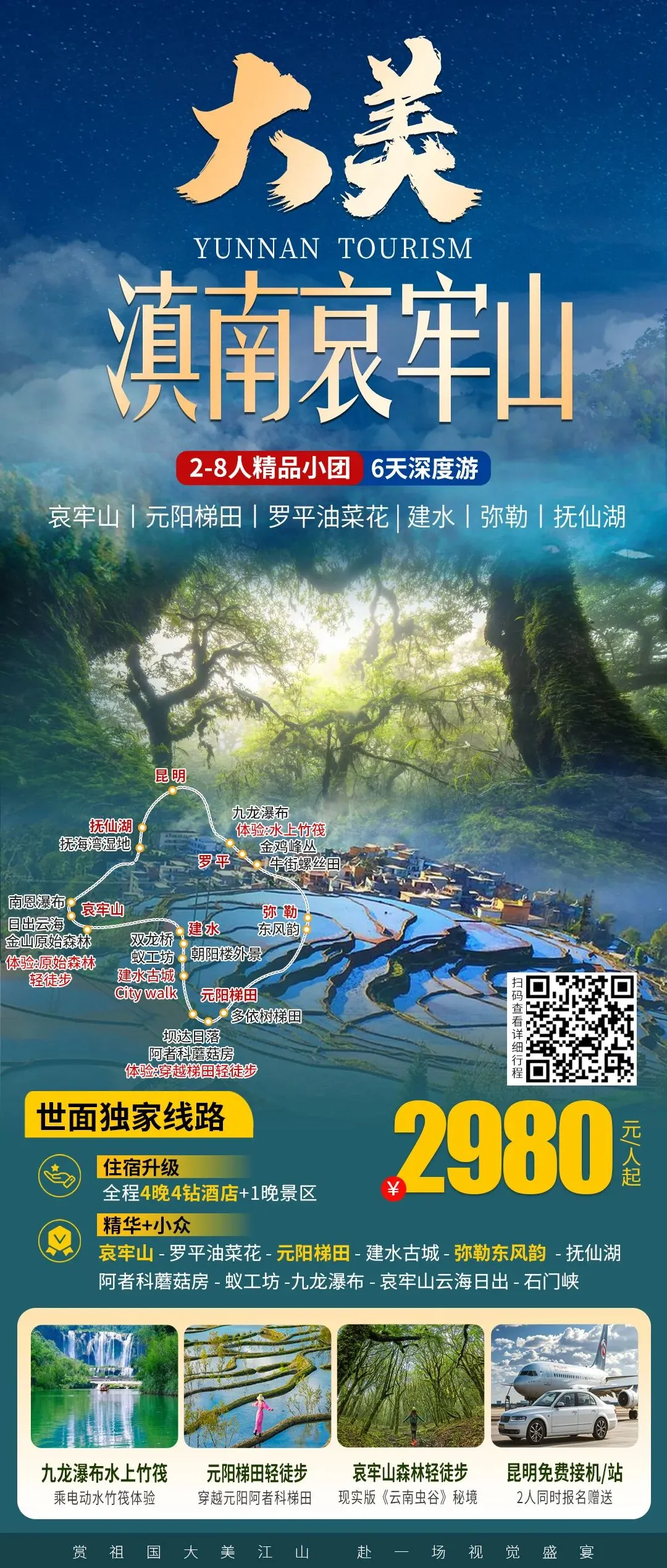 产品亮点:2-8人精品小团出行,升级4晚4钻酒店+1晚景区客栈,金山原始森林+阿者科梯田轻徒步,罗平九龙瀑布乘水上竹筏体验