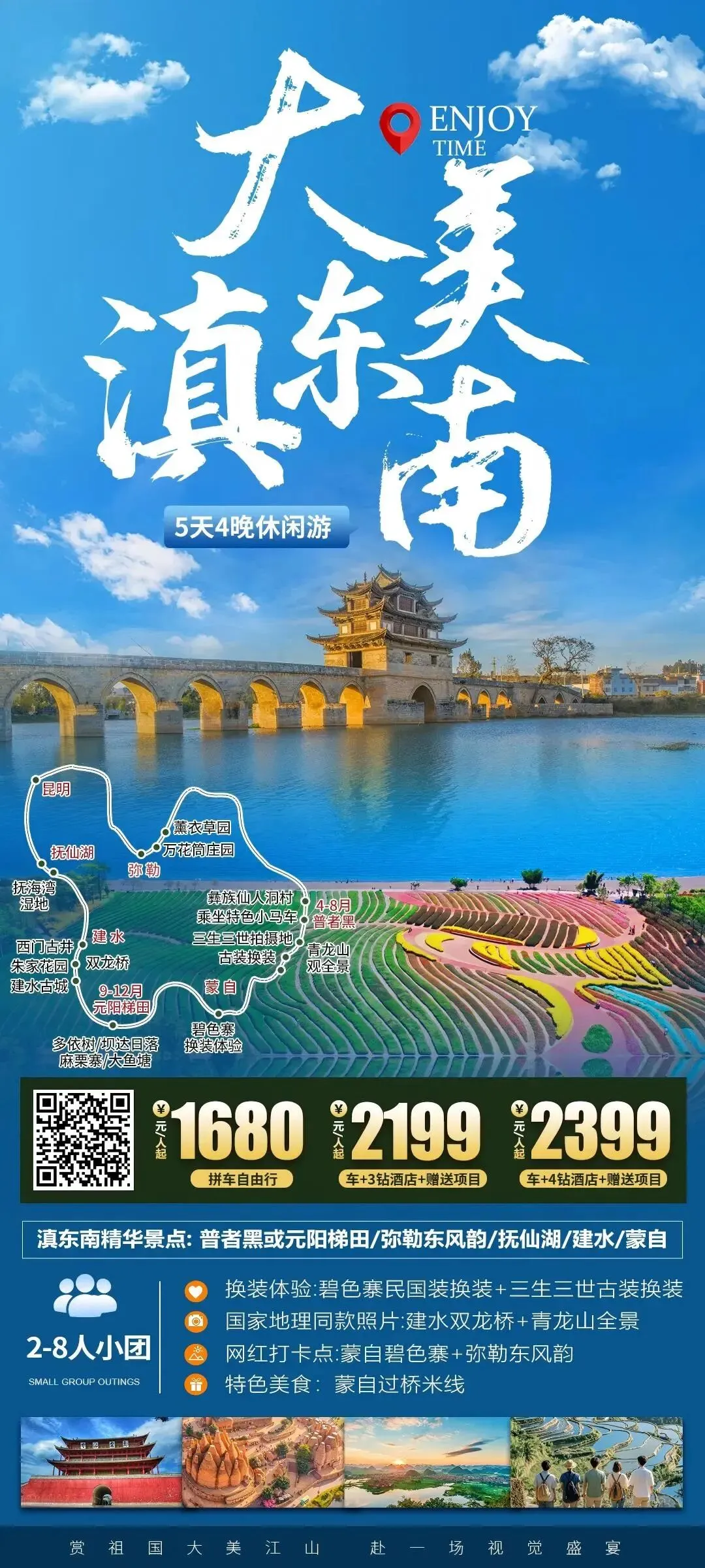 产品亮点:2-8人精品小团,双换装体验(民国装+古装),弥勒泡温泉,过桥米线、仙人洞村乘坐小马车,根据季节性选择普者黑(4-8月)或元阳梯田(9-12月)