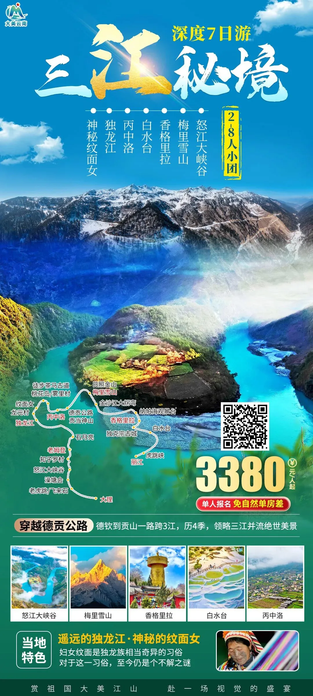 产品亮点:2-8人小团、指定团期满5人升级无人机航拍体验,梅里雪山日照金山、独龙江寻访神秘纹面女、悬崖茶马古道徒步体验、打卡滇藏界、火爆网红点“中国棉花堡”白水台,免自然单房差