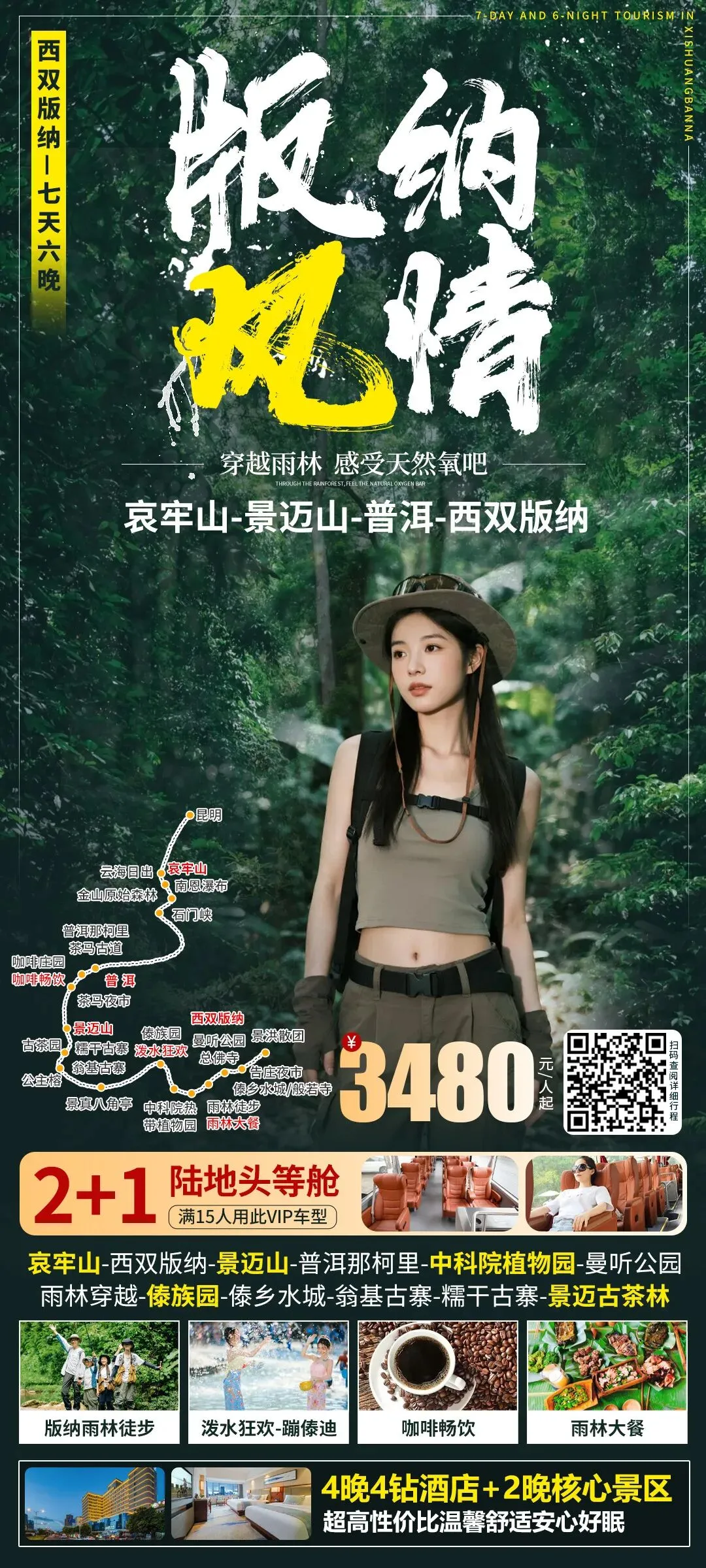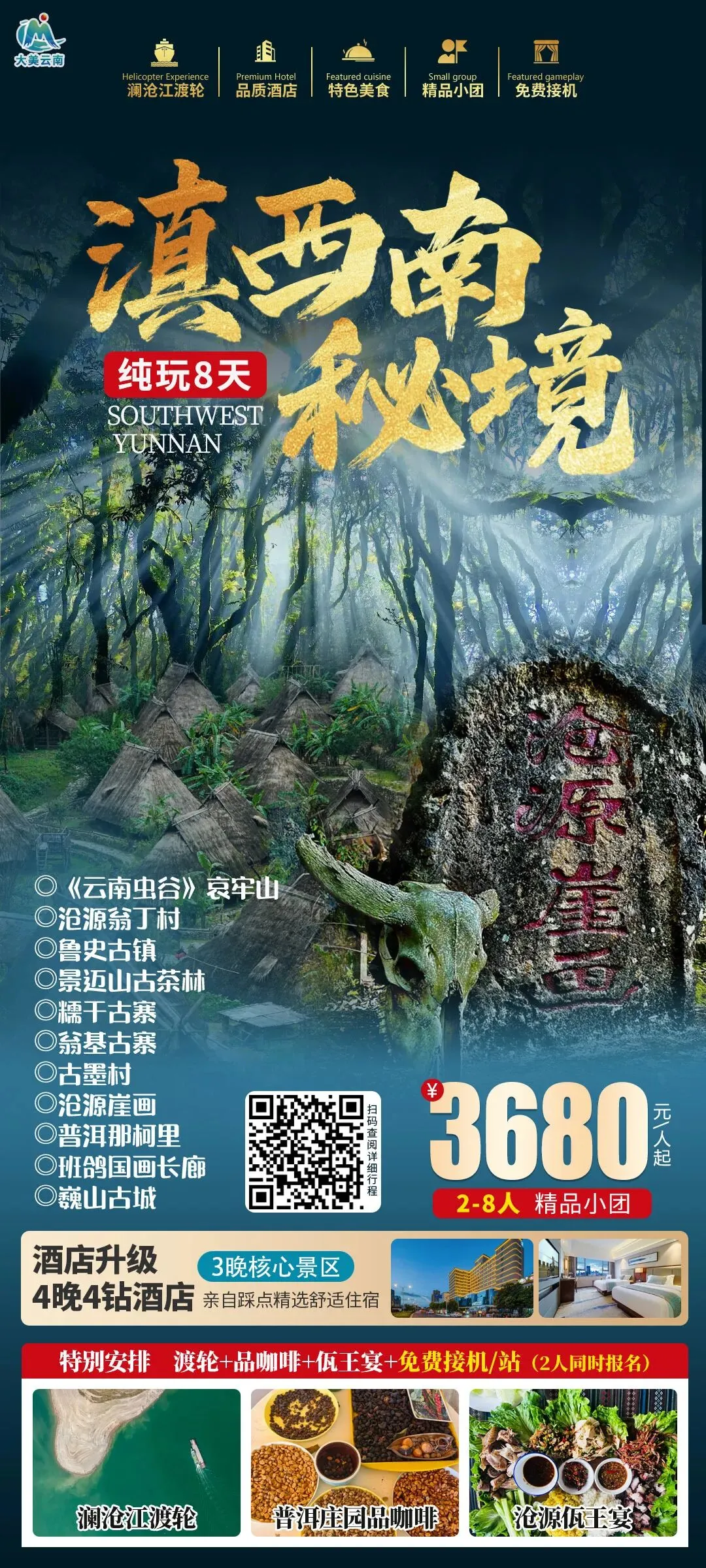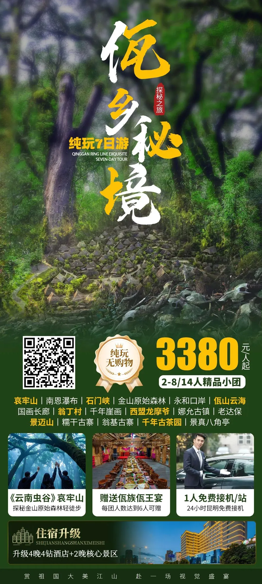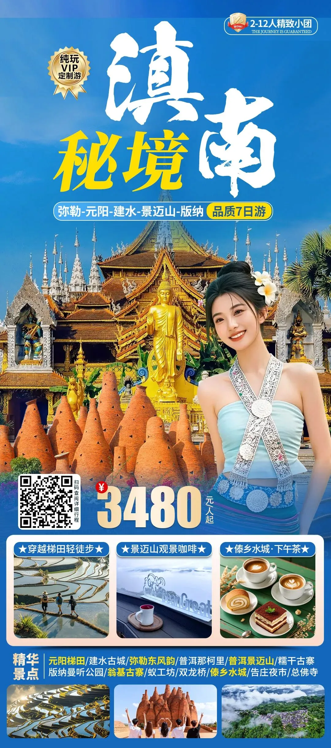产品亮点:2-12人精品小团出行,升级5晚4钻酒店+1晚景区客栈,版纳傣乡水城下午茶,景迈山观景咖啡,元阳穿越梯田轻徒步
