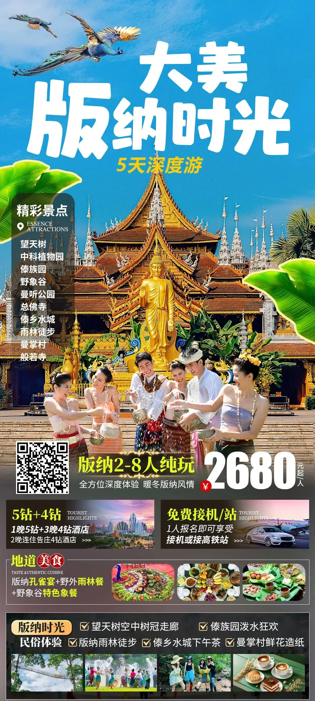 活动主题:中科院热带植物园、望天树、野象谷、傣族园、曼掌村、曼听公园、总佛寺、告庄夜市、曼远村、傣乡水城、般若寺