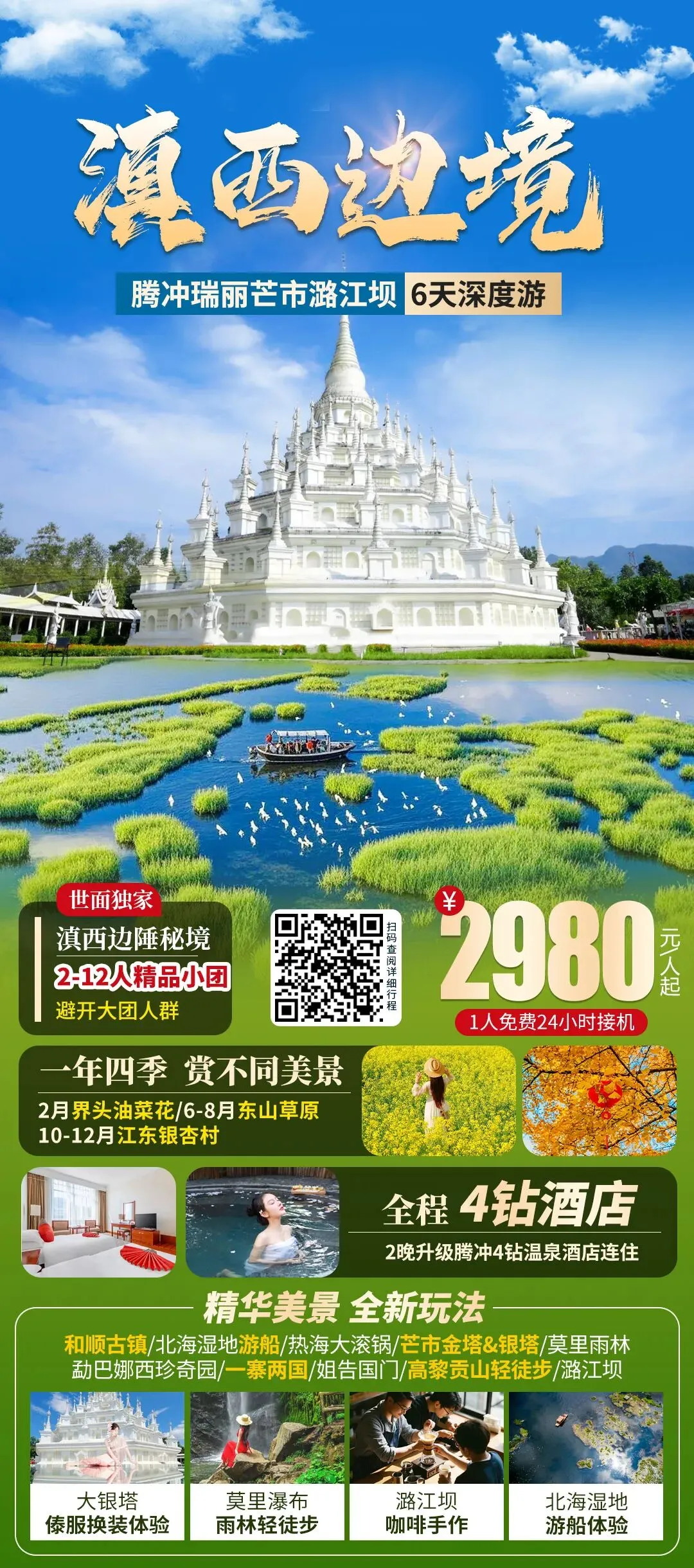 产品亮点:2-12人精品小团出行,全程4钻酒店(腾冲连住2晚温泉酒店),保山潞江坝咖啡手作,芒市银塔傣装换装+盘发,高黎贡山轻徒步+泡野温泉,芒市孔雀宴(满6人赠送)