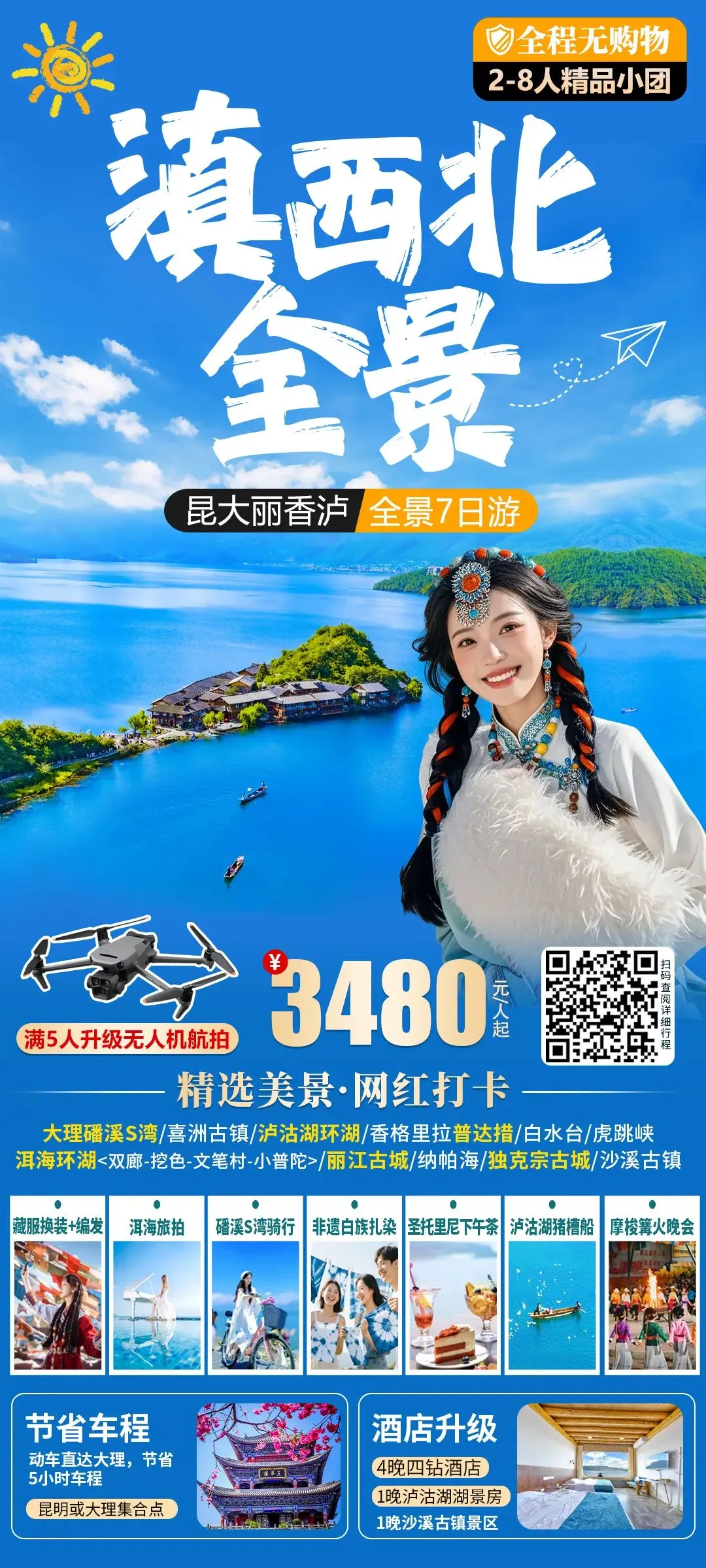 活动主题:大理洱海环湖<磻溪S湾+喜洲古镇+双廊+小普陀+文笔村+圣托里尼>、普达措国家公园、泸沽湖环湖<草海+走婚桥+泸源崖+里格观景台>、丽江古城、独克宗古城、沙溪古镇<古戏台、玉津桥>、白水台、虎跳峡、纳帕海