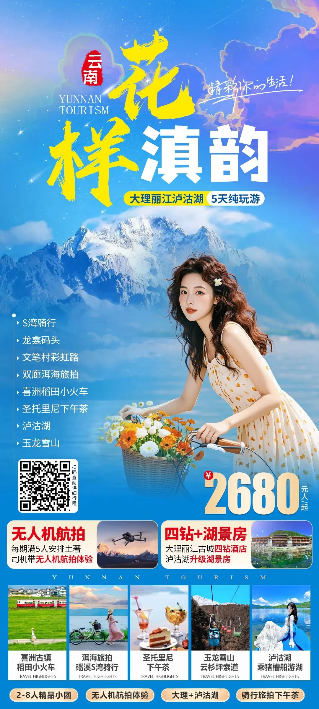 活动主题:玉龙雪山、丽江古城、双廊古镇、磻溪S湾、喜洲稻田、泸沽湖环湖、圣托里尼、文笔村、小普陀、喜洲稻田、云杉坪小索道、蓝月谷