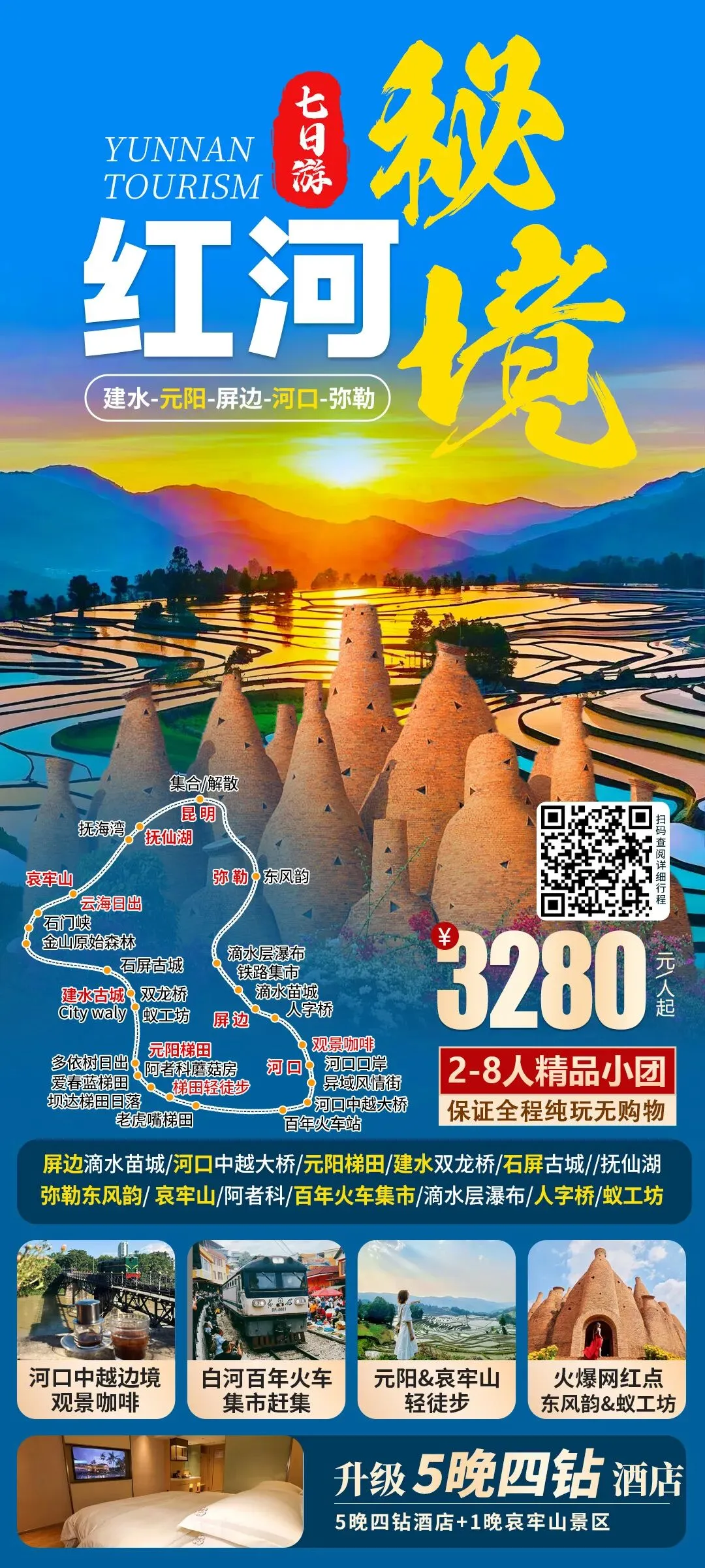 产品亮点:2-8人舒适小团,5晚4钻酒店+1晚核心景区,河口观景咖啡,百年铁路集市赶集,元阳梯田&哀牢山轻徒步体验