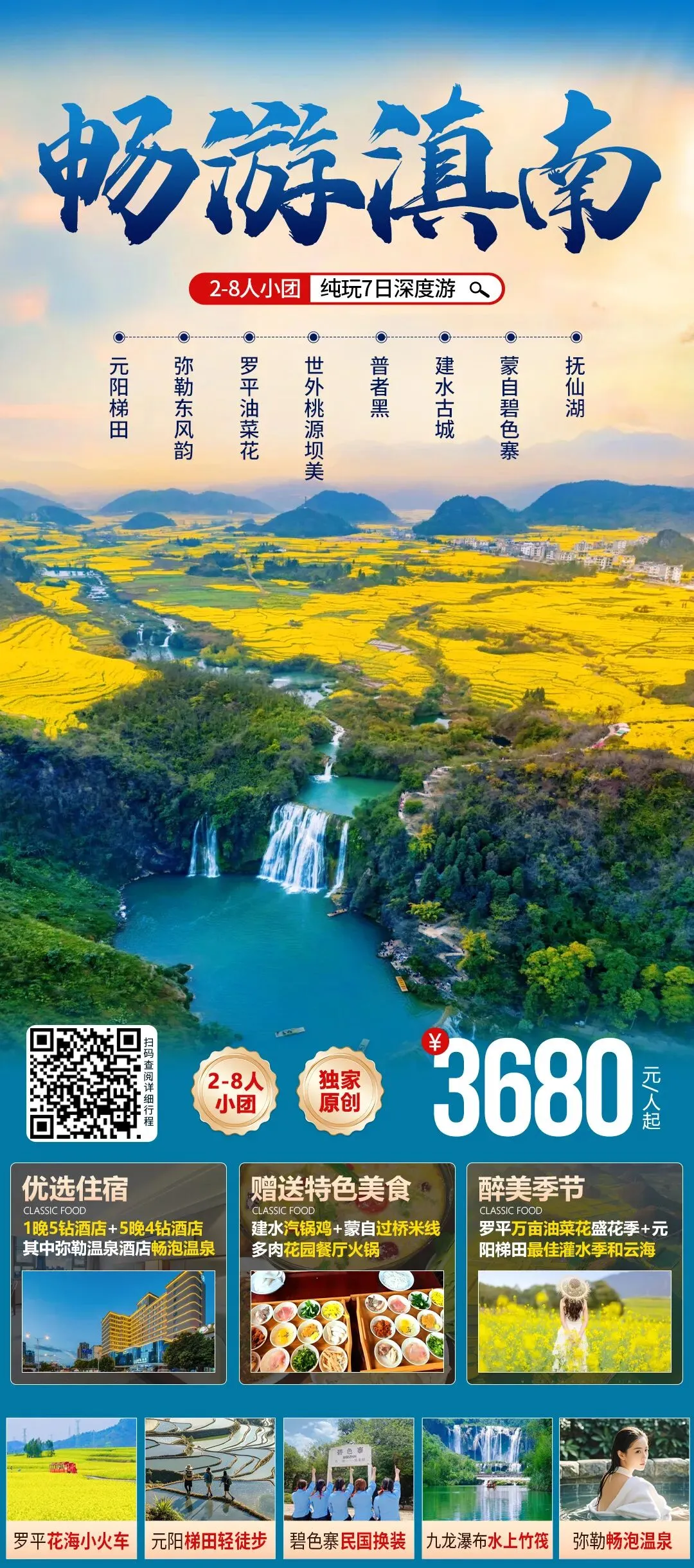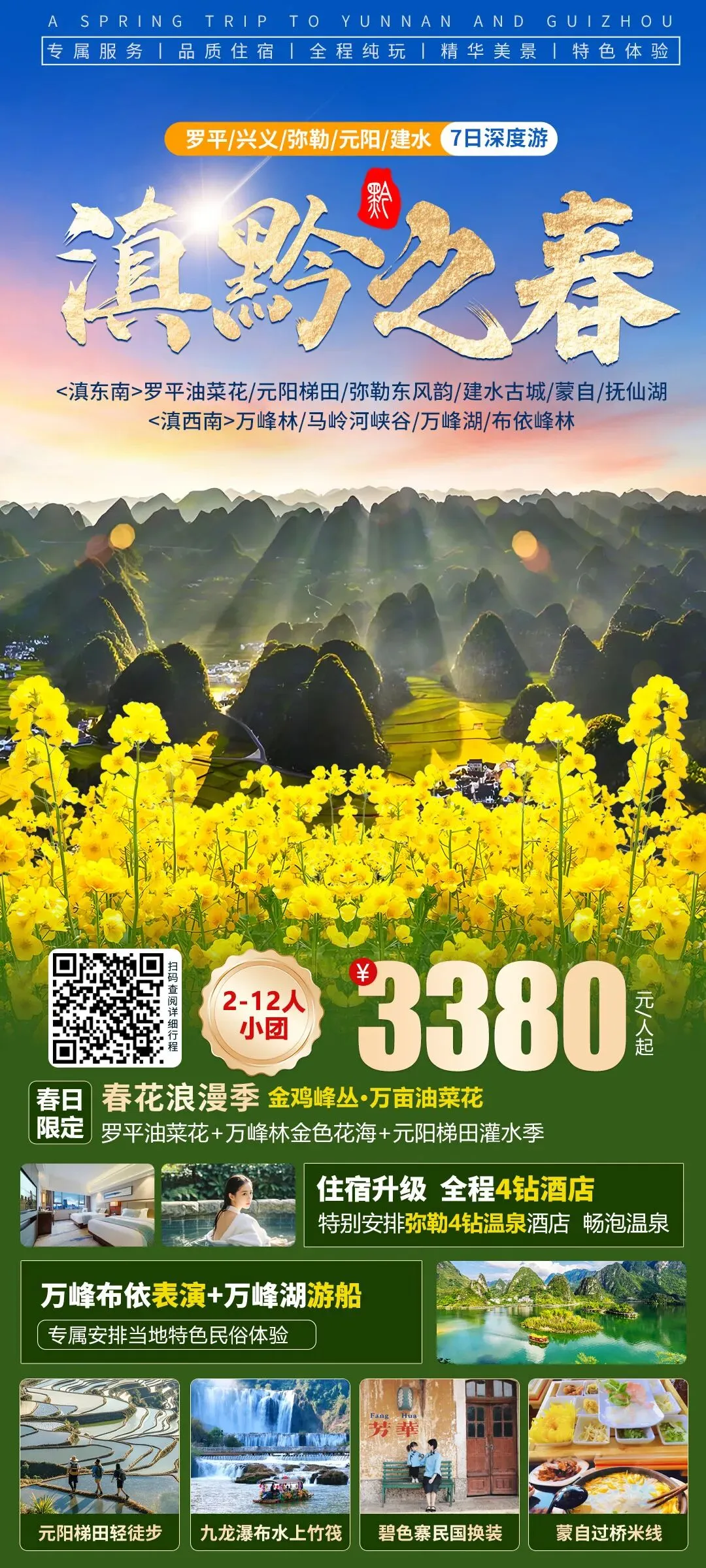 活动主题:元阳梯田、罗平油菜花、兴义万峰林、马岭河峡谷、万峰湖游船、峰林布依、建水古城、弥勒东风韵、碧色寨、抚仙湖、九龙瀑布