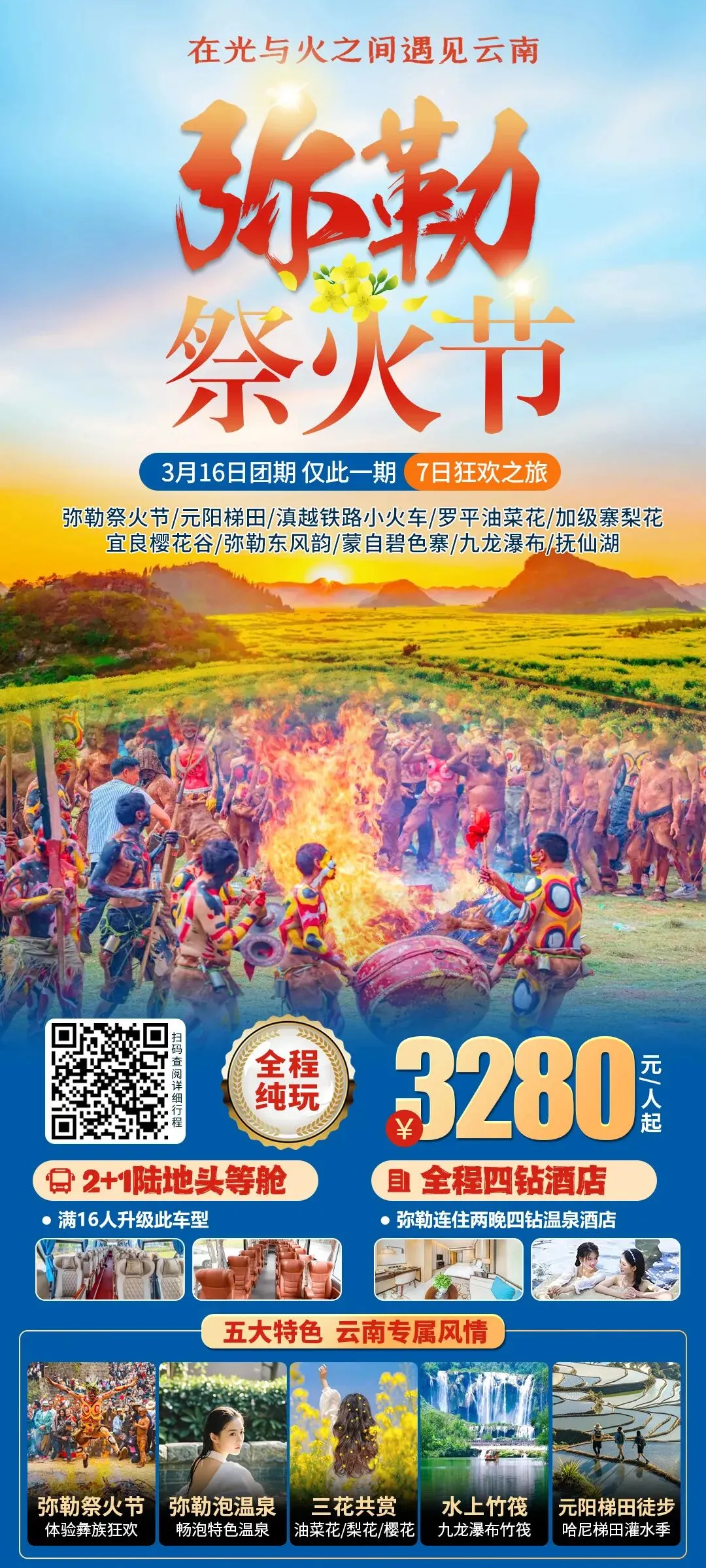 活动主题:祭火节狂欢、元阳梯田、 滇越铁路小火车、罗平油菜花、加级寨梨花、宜良樱花谷、 弥勒东风韵 、 蒙自碧色寨、 九龙瀑布、抚仙湖抚海湾湿地公园
