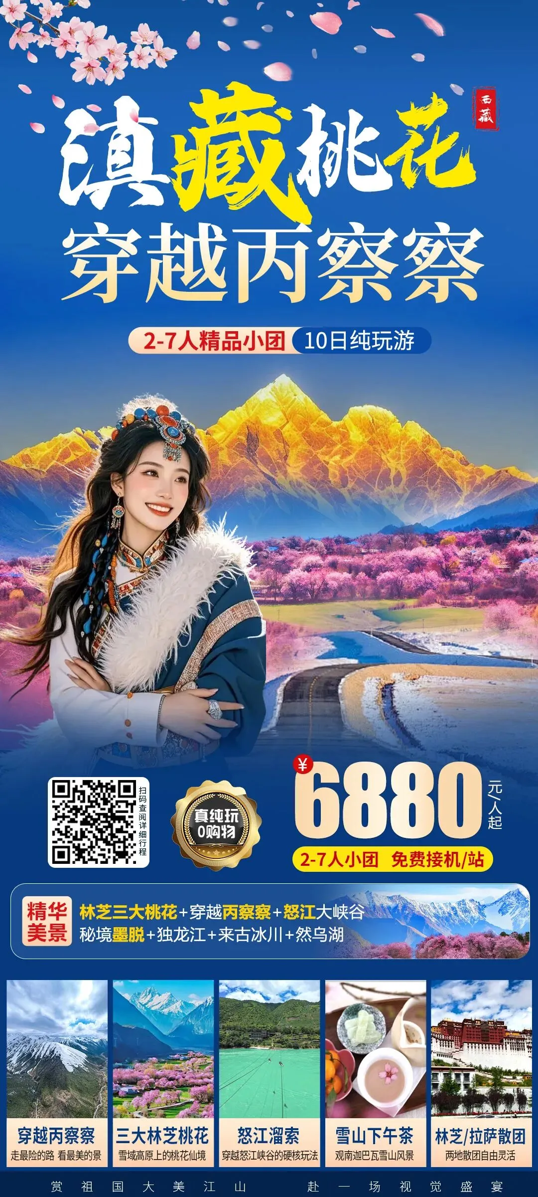 活动主题:丙察察、梅里雪山飞来寺、德贡公路、墨脱、怒江大峡谷、纳帕海观景台、波密桃花沟、嘎啦桃花村、丙中洛、来古冰川、然乌湖、鲁朗小镇、南迦巴瓦日照金山、果果糖大拐弯