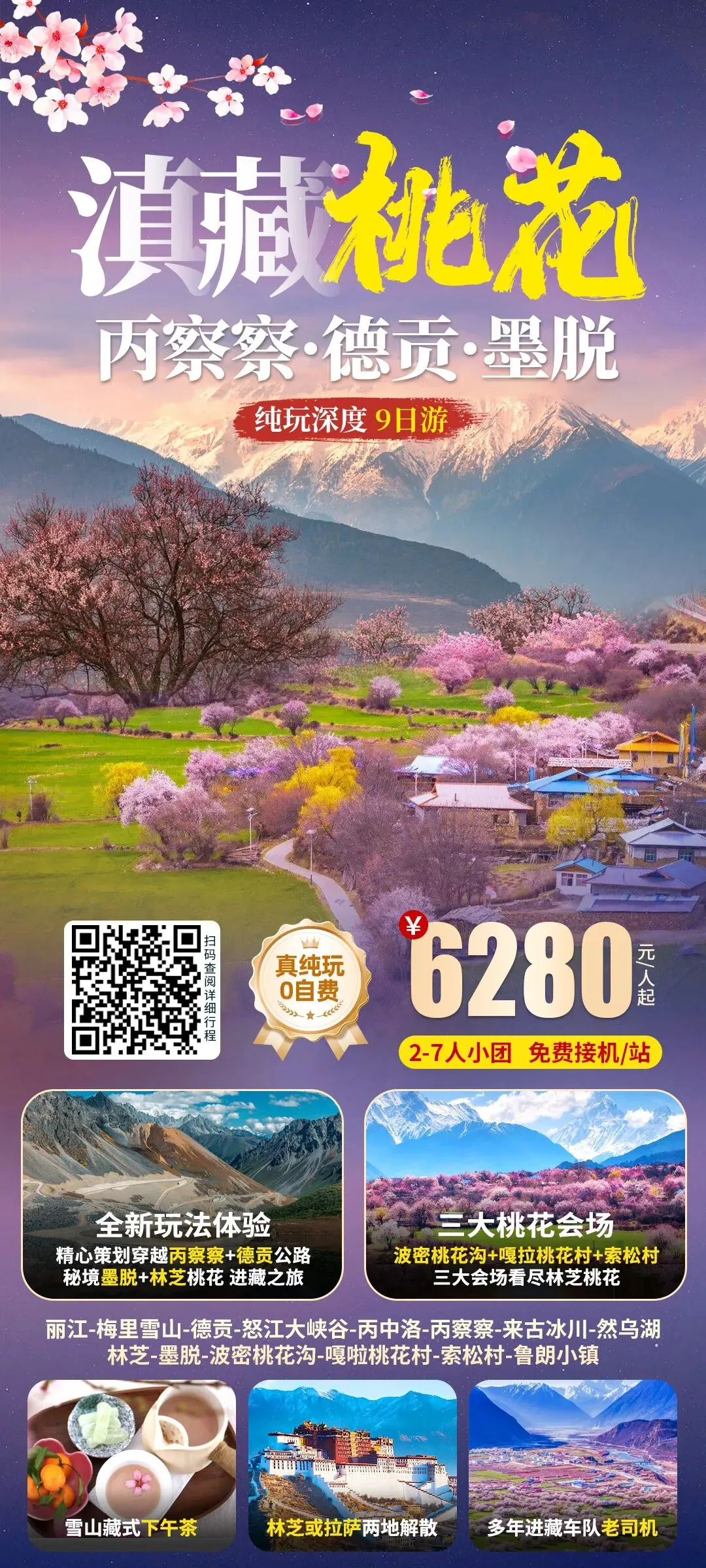 产品亮点:2-7人精品小团,三大桃花圣地<波密桃花沟+嘎拉桃花村+索松村桃花>,索松村雪山下午茶,每人意外保险保额,每人2瓶便捷氧气,林芝或拉萨散团(两地可选)