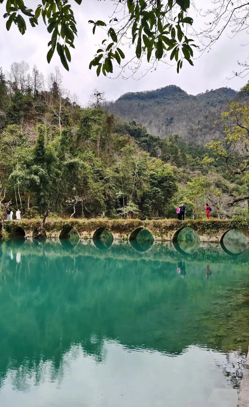 小七孔被叫做"地球上的绿宝石"不是夸张,而是你到了现场真的会觉得这个比喻还不够准确。这个地方的水不是一般意义上的清澈,是那种你站在水边往下看,能清楚看到水底每一块石头、每一根水草的清澈,而且水的颜色不是单一的蓝或者绿,是随着光线和深度变化出好几个层次的蓝绿色,这种颜色在其他地方很难看到,因为它需要特定的地质条件和植被覆盖率才能形成。