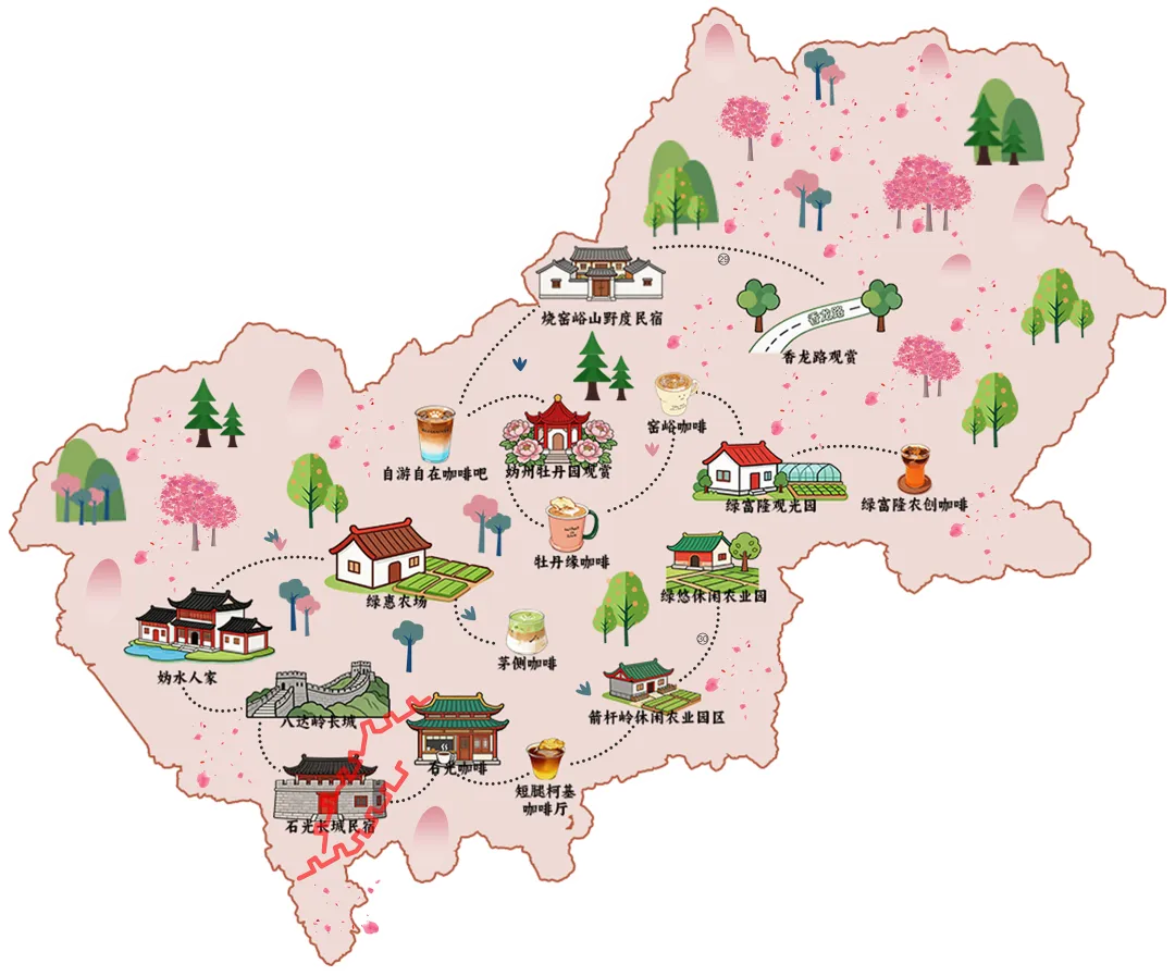 线路:八达岭长城(赏花)→短腿柯基咖啡厅→妫水人家→石光咖啡→石光长城民宿→绿悠休闲园→绿惠农场→箭杆岭休闲农业园区→茅侧咖啡