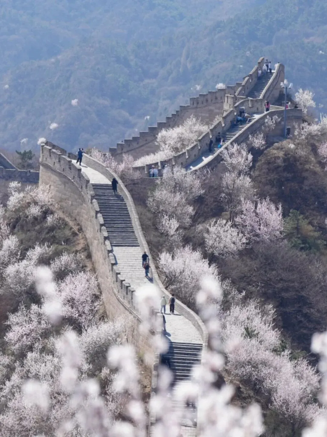 以八达岭长城为开篇,解锁春日长城的独特浪漫。3 月下旬至 4 月中旬,长城脚下山桃、杏花漫山盛放,粉白花海与巍峨雄关交相辉映,既有 “雄关漫道” 的壮阔,又有繁花似锦的柔美,北二楼、南二楼皆是绝佳赏花打卡点。