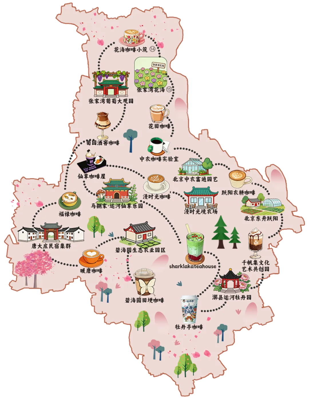 线路:花海→花田咖啡→北京中农富通园艺有限公司→中农咖啡实验室→北京东升跃阳农业生态观光园→跃阳农耕咖啡→马捌家・运河仙草乐园→仙草咖啡屋→漫时光境休闲农场→漫时光咖啡→漷县运河牡丹园→牡丹亭咖啡→千帆集文化艺术共创园→sharklakateahouse→崇义非遗砂锅宴