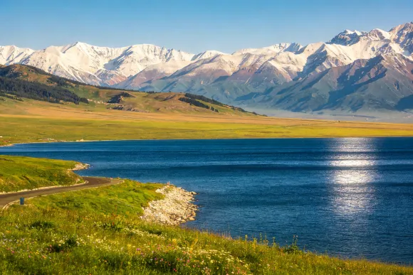 • 天山天池:雪山倒映在碧绿湖水中,湖光山色相映成趣,美不胜收。