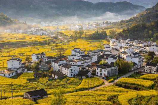 • 油菜花:金黄的油菜花铺满梯田,与粉墙黛瓦的古民居相映,宛如水墨画卷;
