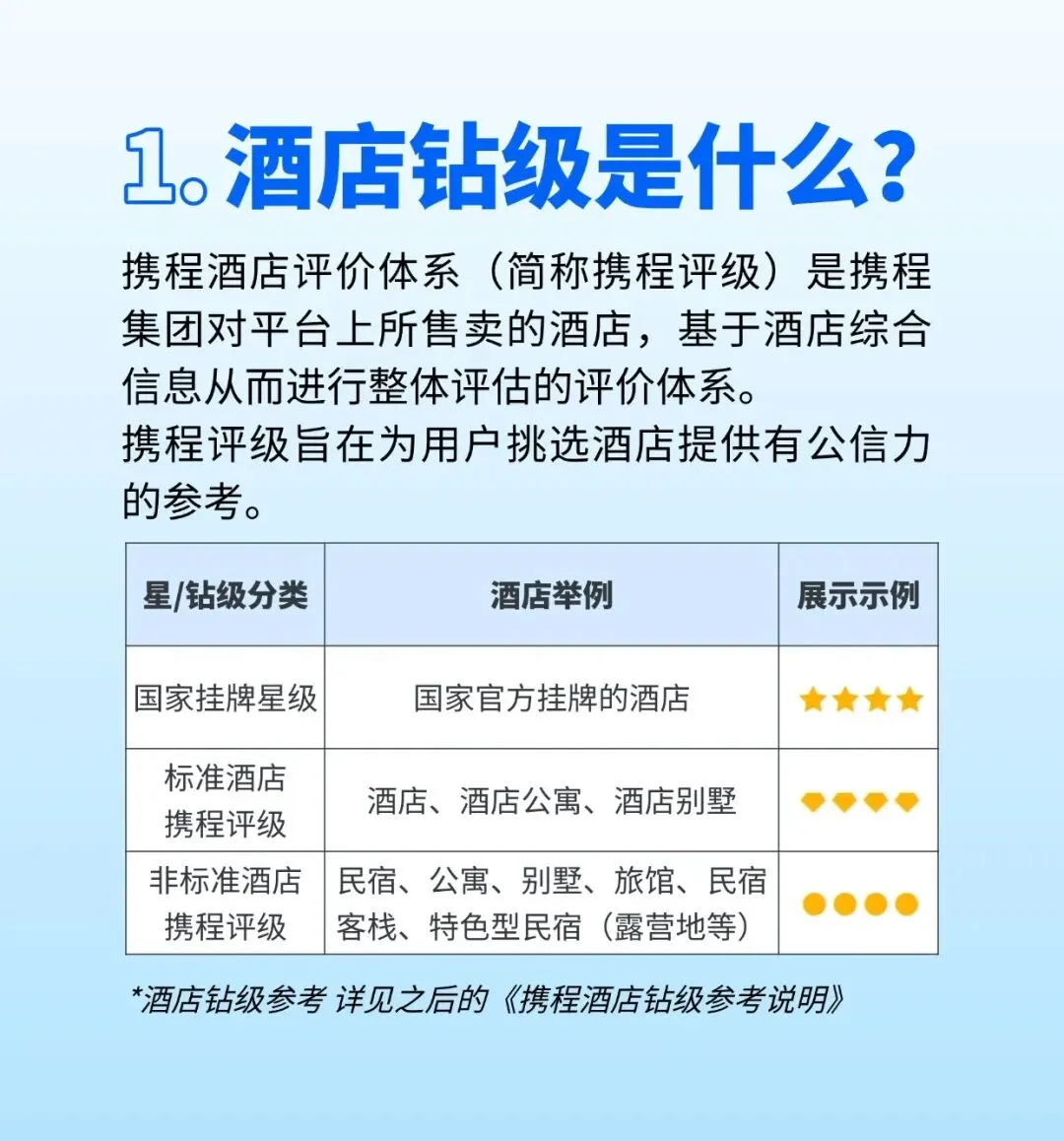 消费者可以在预订酒店的页面,看到钻级和星级酒店的不同标志,根据不同的需求做选择。同时,携程也在页面上公示钻级评定的对应标准说明,以帮助消费者理解钻级含义。