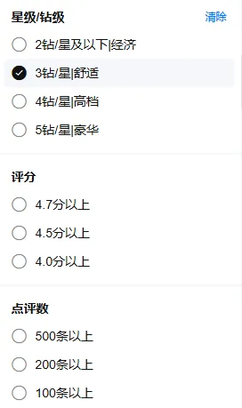 在预订平台选酒店时,点击“选择价格/星级”按钮后,出现的是“四星(钻)”“五星(钻)”等选项,有些平台叫二星/经济型、三星/舒适型、四星/高档型、五星/豪华型,这里的豪华型指的就是五钻。