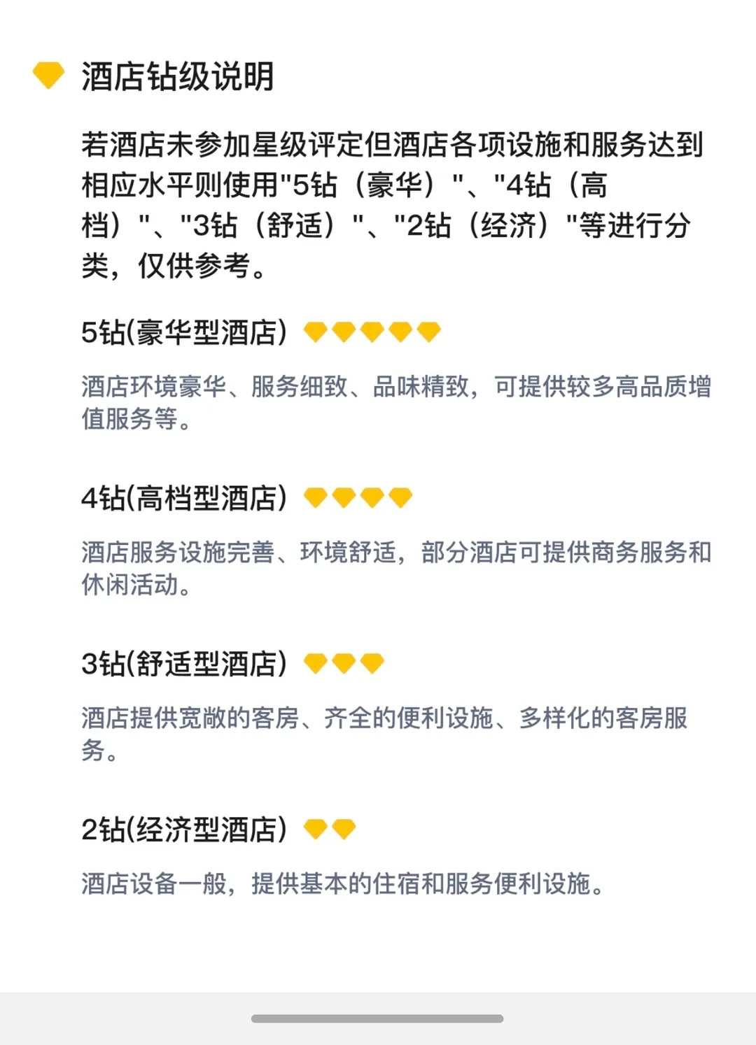 若酒店未参加星级评定但酒店各项设施和服务等达到相应水平,则使用“五钻(豪华)”、“四钻(高档)”、“三钻(舒适)”、“二钻(经济)”等进行分类,仅供参考: