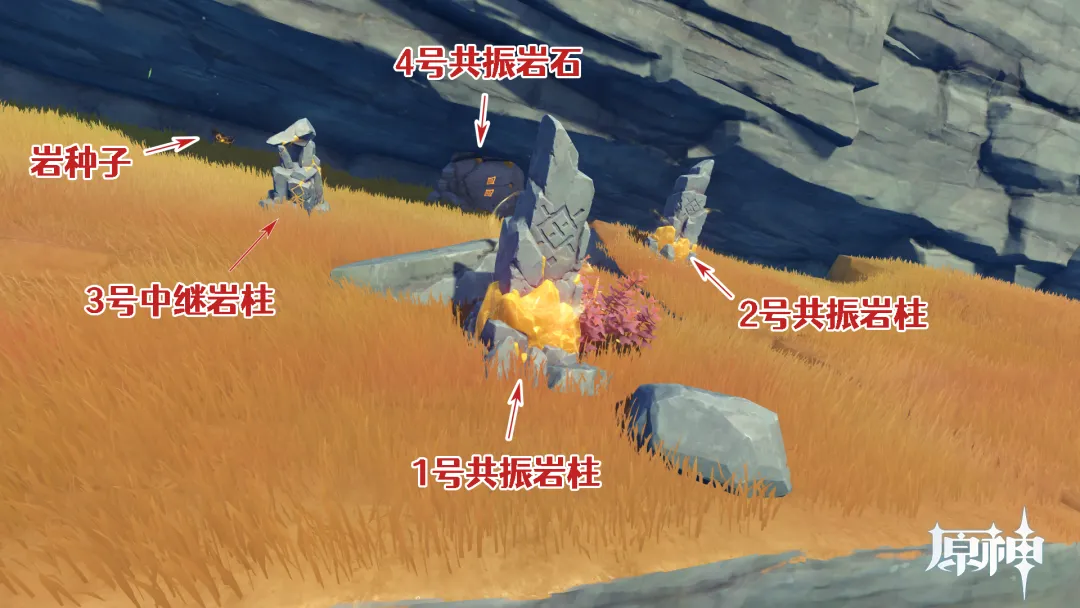 但3号中继岩柱尚未激活,因此需要我们先拾取岩种子将其激活,之后再击打1号共振岩柱。
