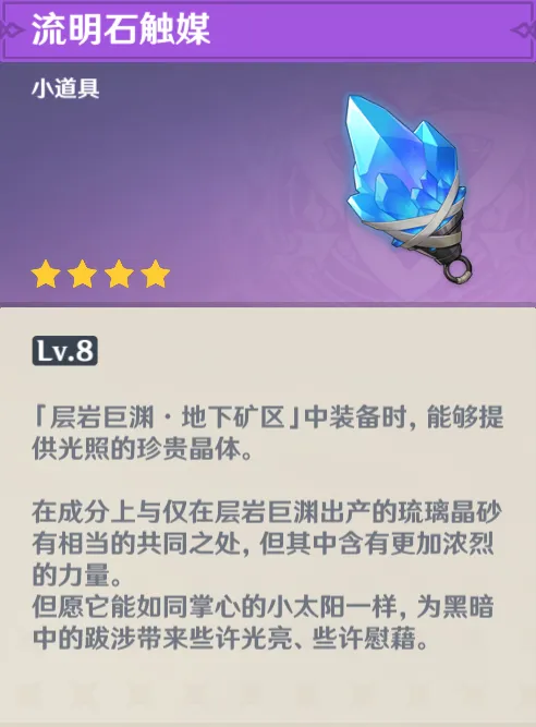 介绍:流明石触媒是仅在层岩巨渊·地下矿区生效的一种小道具,装备后,若其中储存有能量,则可以在探索时为我们提供光照。点击Z键使用时,会消耗1格能量释放技能「纯光绽放」,用于探索、解谜等,后面会详细进行介绍。