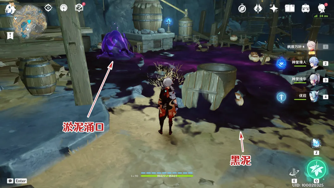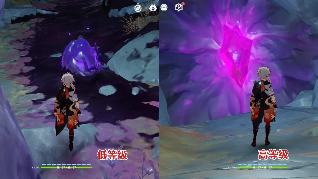 ①诡异的「黑泥」/淤泥涌口:在层岩巨渊的地下矿区,有时能看到一些泛着诡异紫色光芒的淤泥,当旅行者走到这些淤泥上时,会持续损失生命值,同时无法使用冲刺或替代冲刺的能力(例如角色神里绫华,无法在黑泥区域通过冲刺为普通攻击进行冰元素附魔),流明石触媒中的能量也会流失。