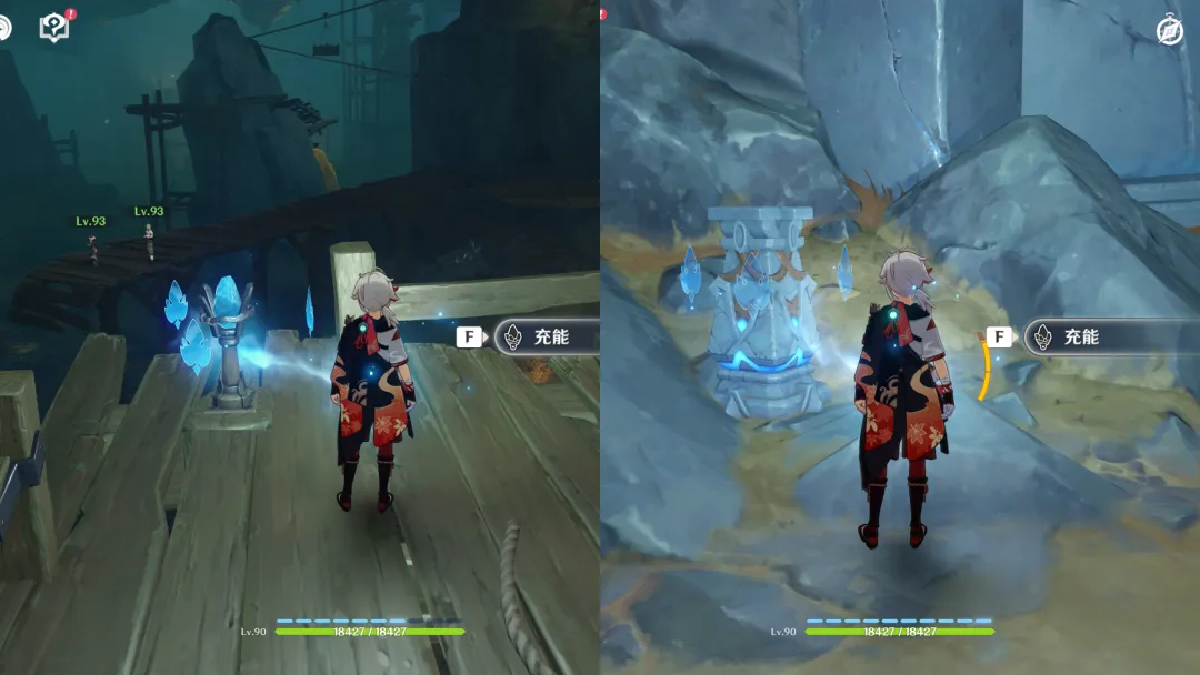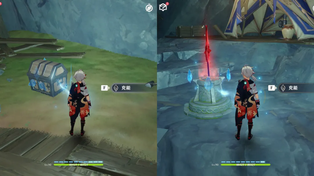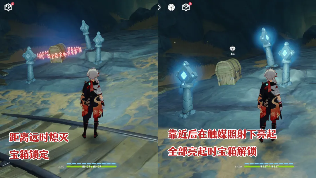 ④充能宝箱、挑战:这个就很容易理解了,我们只需要靠近这类型的宝箱或挑战,使用流明石触媒进行充能,即可解除封印,获得宝箱或开启挑战。