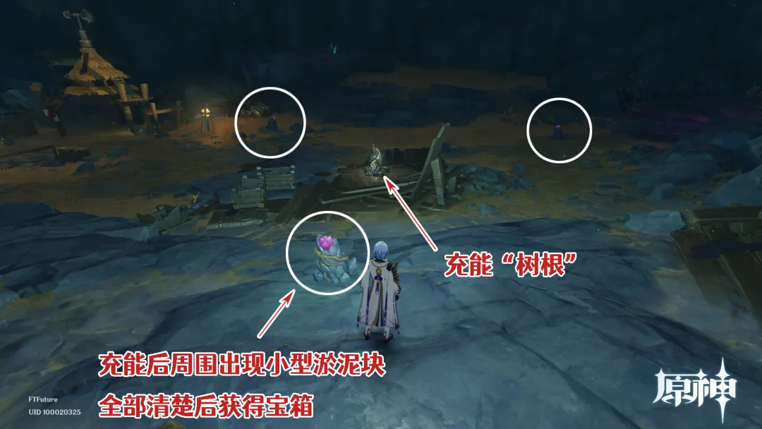 ③充能“树根”:这种类似树根形状的机关,可以靠近交互为其充能,充能后会在周围出现一些小型的淤泥块,通过「纯光绽放」将这些淤泥块全部清除后,即可获得宝箱。