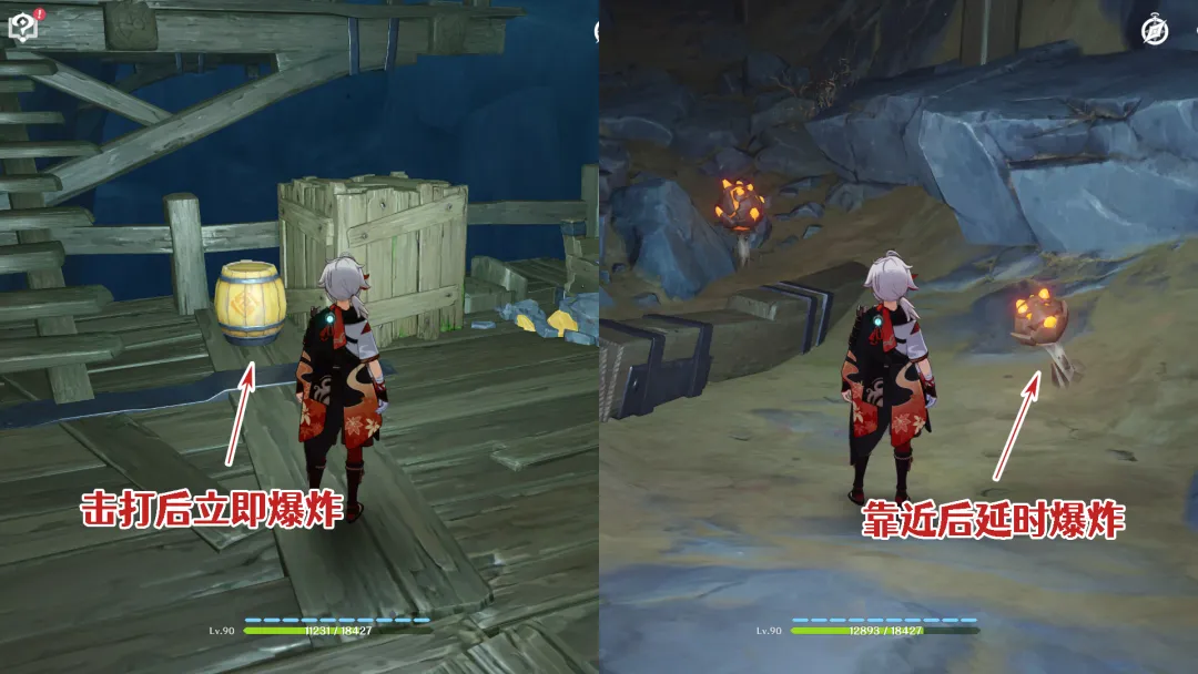 “岩炸药桶”会在受到攻击后立即爆炸,而“岩爆炸果”则会在旅行者靠近时就触发,之后延时爆炸,通过这类道具产生的爆炸,可以破坏这种石墙。