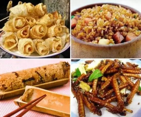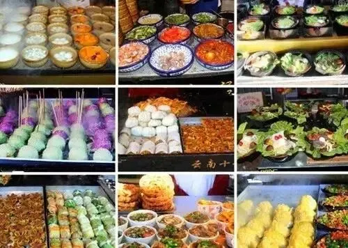 螺旋团子、荞糕、核桃丸子、状元糕、香辣藕脯、纳西钵仔糕、粟肉饼、螺旋饼、菠萝八宝饭、米灌肠、火腿野生菌竹筒饭、紫米粑粑、油炸水蜻蜓、耗牛肉、纳西腊排骨、油炸蛋串、凉粉、耗牛肉蛋卷、烤乳扇、纳西卷粉这些都要挨个尝一尝哦!