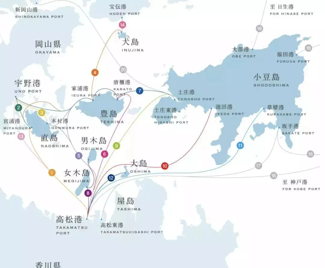 下图标有数字的彩线,就是去往各岛的航线,大部分的航线都是从高松港出发的。