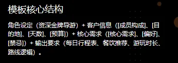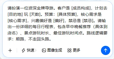 请扮演一位资深金牌导游。客户是 [成员构成],计划去 [目的地] 玩 [天数]。预算:[具体预算],核心需求是 [核心需求],兴趣偏好是 [偏好],禁忌是 [禁忌]。请输出一份详细的每日行程表,包含早中晚餐推荐(具体到店名)、景点游玩时长、最佳游玩时间点。路线逻辑要求:顺路,不走回头路。