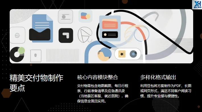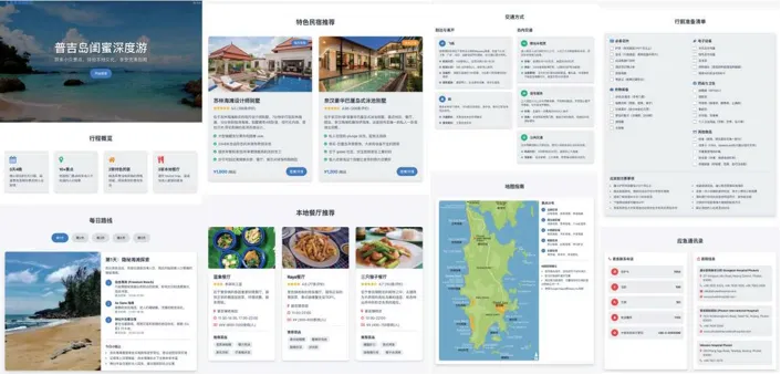 精美交付:做成 PDF / 长图 / 网页,包含地图、行程表、行李清单、应急通讯录;