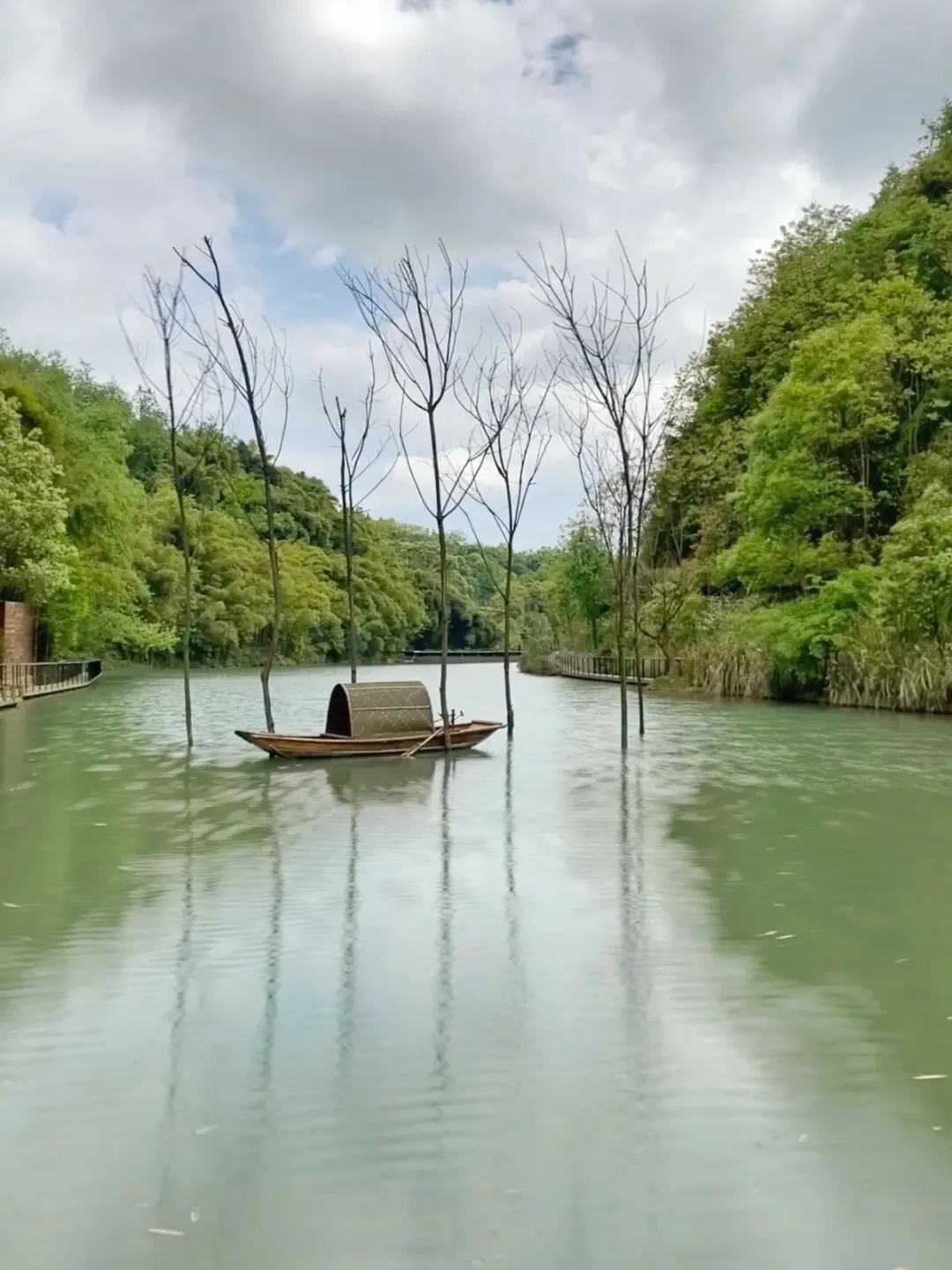 深山之间,一汪碧湖,一叶扁舟,完全就是理想中的世外桃源即视感。