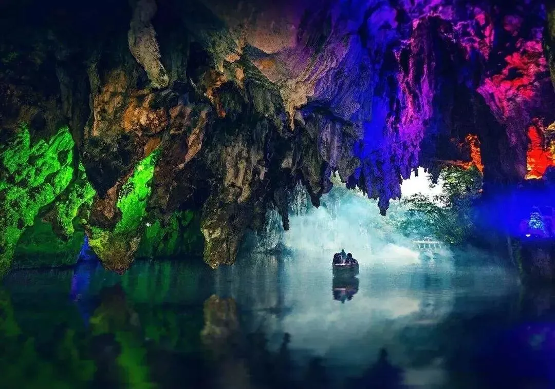 最绝的是乘船游览溶洞,长达数十分钟的游览,七彩的光映衬在喀斯特景观上,形成一个光怪陆离的世界,宛若电影里的地下仙宫。
