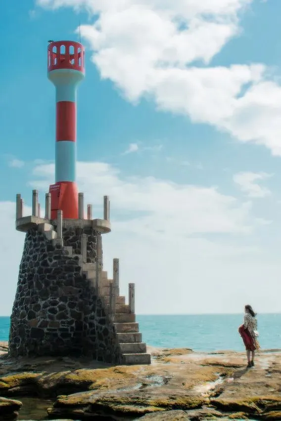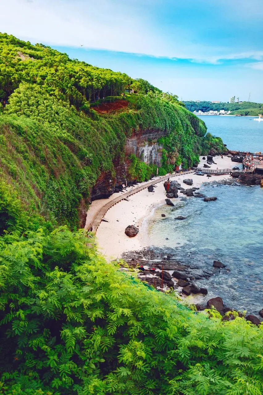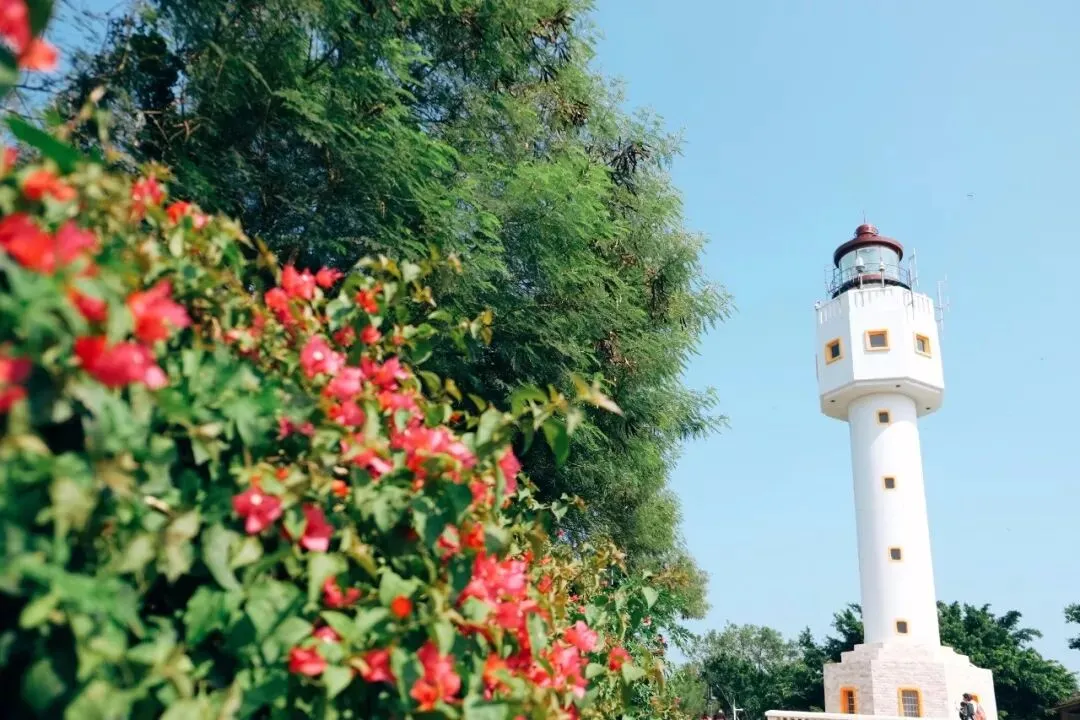 鳄鱼山是地质公园的核心景区,一入内就看到高耸的白色灯塔,在红色三角梅和绿植的映衬下每一幕都炒鸡治愈。