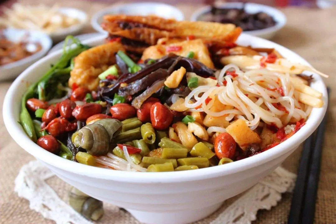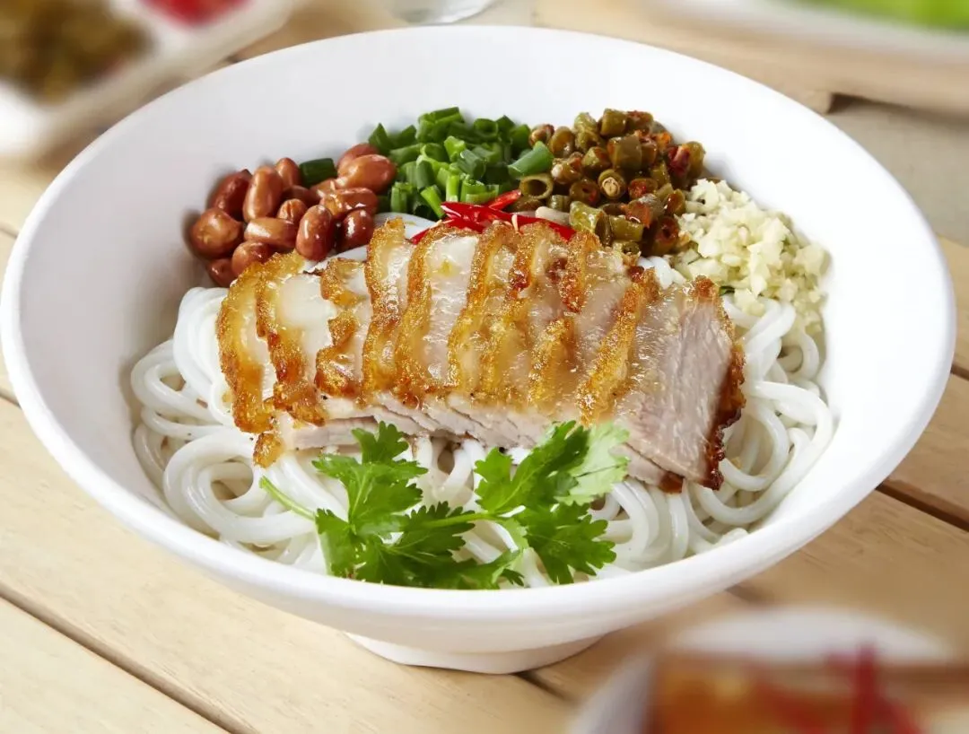 桂林米粉来了必须给我嗦米粉,上面铺着脆皮和锅烧,再淋上一勺卤水加上酸笋、酸豆角、葱花香菜等每一口都是酸爽!